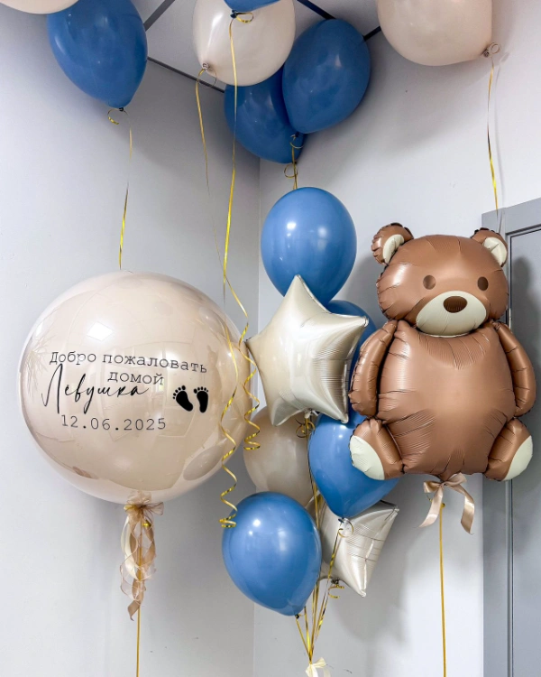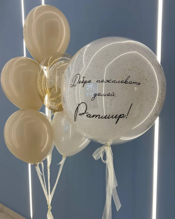 - Крупный размер — около 60 см. Стоимость составляет примерно 2200 рублей. Этот размер позволяет размещать большие надписи, фотографии, использовать широкие ленты, фатин и мини-фигурки.